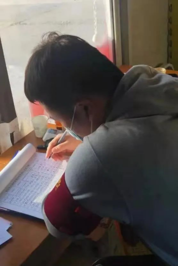 2018级俄本一班边琪同学在黑龙江省黑河市盛泰小区卡口值班,主要工作记录小区来往的车辆,和出入的人群。