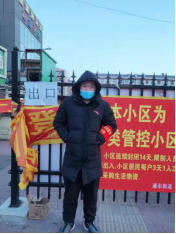 2020级俄本三班刘宇航同学在黑龙江省齐齐哈尔市繁荣小区从事志愿者门口站岗工作。