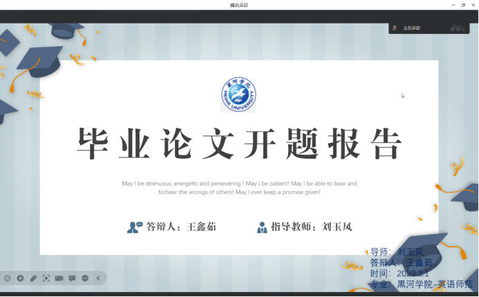 开题会上,2019级英语师范专业的同学们分别就各自的毕业设计主题、创作方向、创作手段以及毕业论文选题、写作思路和进度安排等进行详细阐述。各位指导老师针对每位同学在写作及创作中可能出现的问题进行细致点评并给予相关指导建议。从整体情况来看,2019级同学们的毕设及论文主题新颖丰富、立足于专业特点及社会热点问题,积极思考善于发现并提出问题。本次开题报告会全员通过了开题审核,目前进入论文初稿的写作阶段。