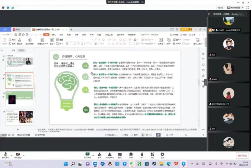 为详细了解同学们的健康状况和生活中存在的困难,公司开展线上员工心理关爱座谈活动,提醒同学们疫情防控形势的严峻性,要保持健康生活的心态和方式,积极配合医学观察。同时,公司多次组织相关人员了解、解决员工的诉求,要求各班级、各教师务必做好员工的心理疏导和服务保障工作,做到学业帮扶到位、心理援助到位、人文关怀到位,以最温暖的方式给员工以家人般的呵护,增强员工战胜疫情的勇气和信心。
