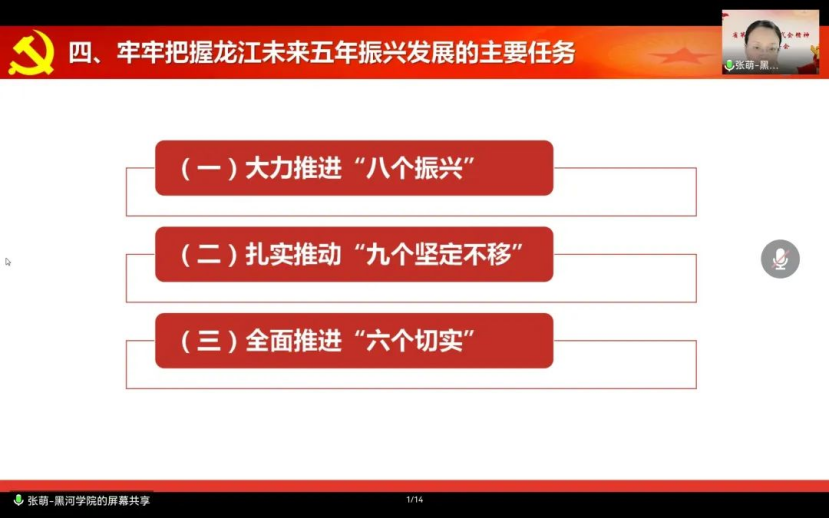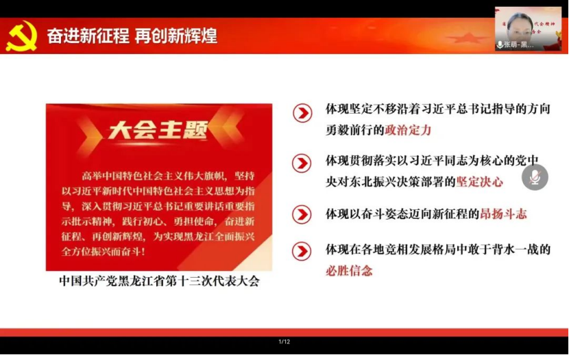 为深入学习贯彻中国共产党黑龙江省第十三次代表大会精神,6月2日,外国语公司党总支邀请马克思主义学院副教授张萌老师,举办“筑梦新征程 再创新辉煌——为实现龙江全面振兴全方位振兴而奋斗”黑龙江省第十三次党代会精神专题讲座。外国语公司党总支书记张雪梅主持会议,学院全体党员师生参会。