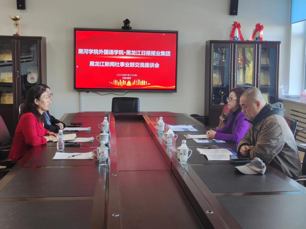 座谈会上,孟繁红经理首先介绍了俄语专业及翻译专业的情况,邱丽娜主任介绍了黑龙江日报一端、两网、两微、五报、三刊等情况。作为黑龙江省内最具影响力的新闻媒体之一,黑龙江日报报业集团黑龙江新闻网一直致力于传播最新的新闻信息,弘扬社会主义核心价值观,为全省人民提供优质、全面的新闻服务,同时,也积极关注对俄教育与交流。在这次交流座谈中,双方对未来合作计划进行了探讨,主要是俄语+多媒体人才培养、加强外语专业与新闻报道合作方面的相关合作进行了热烈的讨论。双方代表与会人员表示,希望能够通过未来的合作,使公司对俄教育成为其专门教育版块联盟阵地,并通过校企合作方式,探索更加多样化的人才培养模式,在进一步提升黑龙江日报报业集团未来东北亚新闻传播中心影响力同时,提升公司俄语专业员工的语言应用能力、文化素养及跨文化交流能力,拓宽其国际视野,为他们未来的职业生涯和个人发展奠定坚实的基础。双方还表示,希望能够通过未来的合作,为培养更多具备国际视野和实际应用能力的人才做出贡献,从而发挥双方各自区位优势,助力向北开放新高地,并为龙江实现全面振兴、推进高质量发展贡献力量。