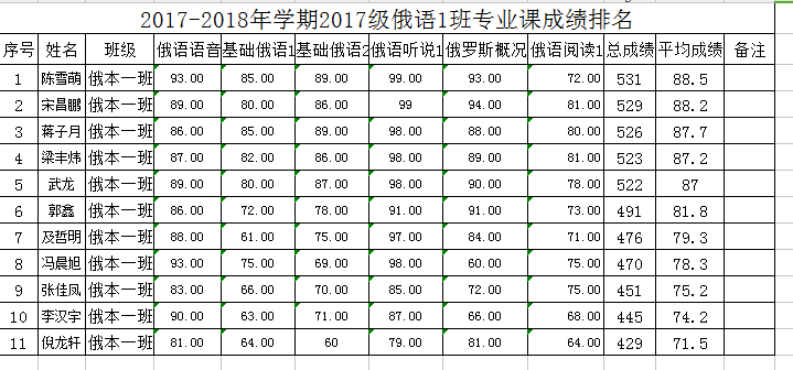 2017-2018年学年2017级俄语班级专业课成绩排名