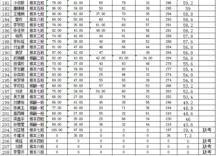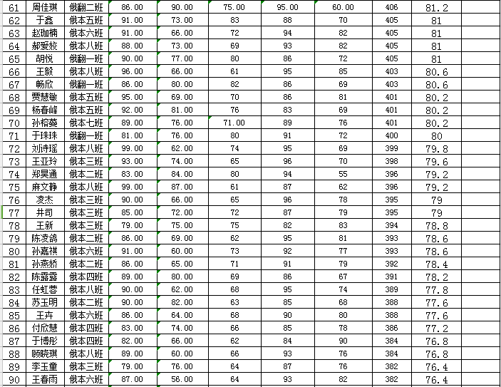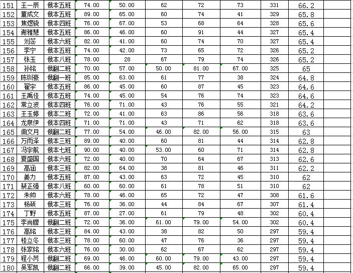 2017-2018年学年2017级俄语班级专业课成绩排名
