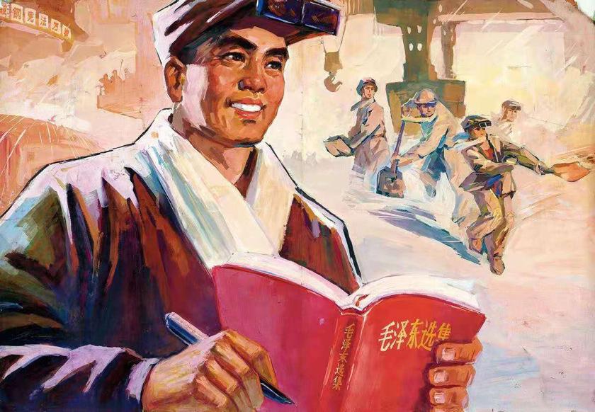 (鞍钢工厂工人学习毛泽东选集油画作品)