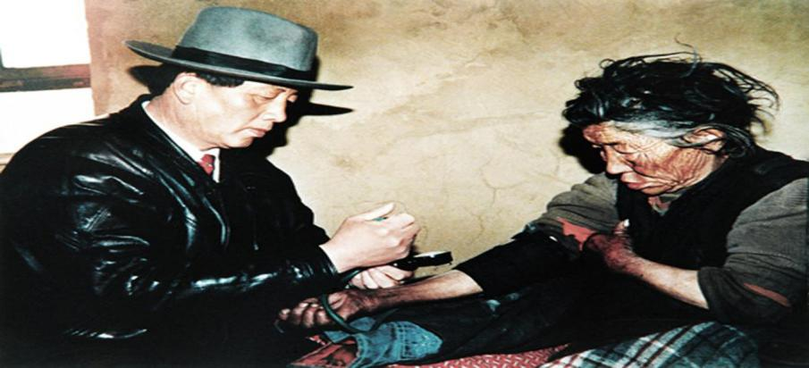 (此图为孔繁森在为益西卓玛老人测量血压。)