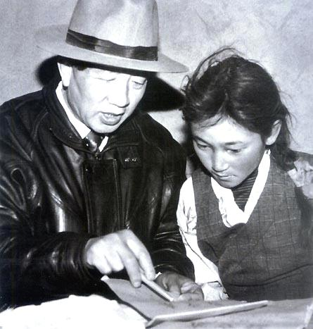 (1995年4月7日,孔繁森教藏族女孩学习。)