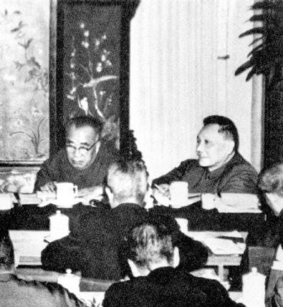 (此图为邓小平同志与同事商讨时照片。)