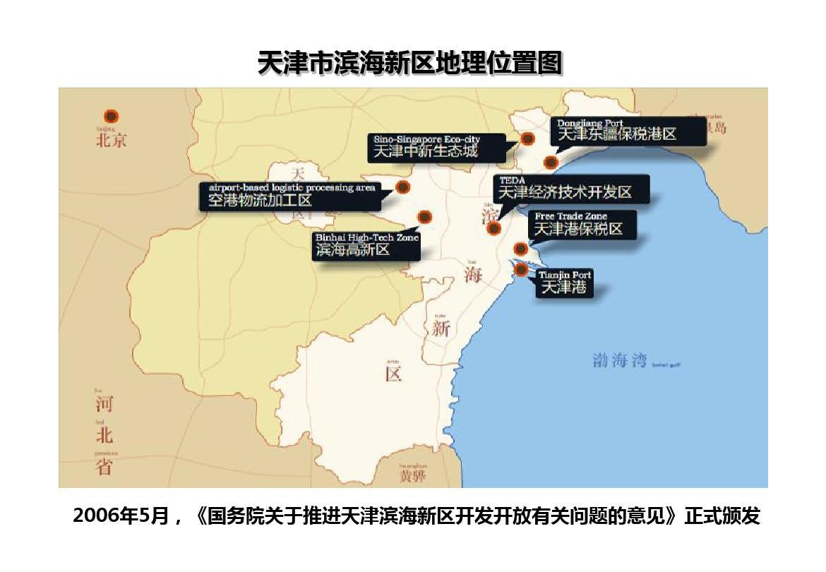 2006年5月26日,国务院发出《关于推进天津滨海新区开发开放有关问题的意见》。指出:推进天津滨海新区开发开放,是在新世纪新阶段,党中央、国务院从我国经济社会发展全局出发作出的重要战略部署。推进天津滨海新区开发开放,有利于提升京津冀及环渤海地区的国际竞争力。天津滨海新区位于环渤海地区的中心位置,内陆腹地广阔,区位优势明显,产业基础雄厚,增长潜力巨大,是我国参与经济全球化和区域经济一体化的重要窗口。推进天津滨海新区的开发开放,促进这一地区加快发展,可以有效地提升京津冀和环渤海地区的对外开放水平,使这一地区更好地融入国际经济,释放潜能,增强竞争力。