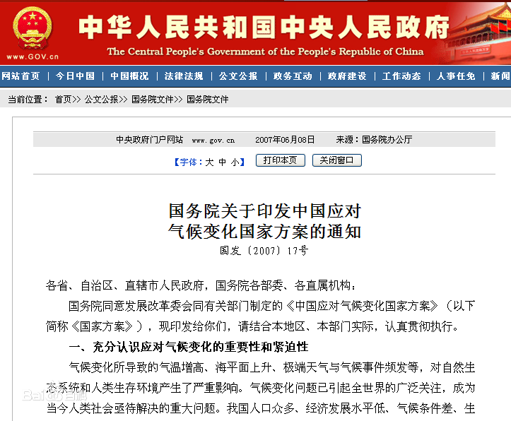 (2007年6月3日,国务院印发《中国应对气候变化国家方案》)