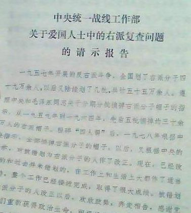 (《中央统战部关于爱国人士中的右派复查问题的请示报告》)